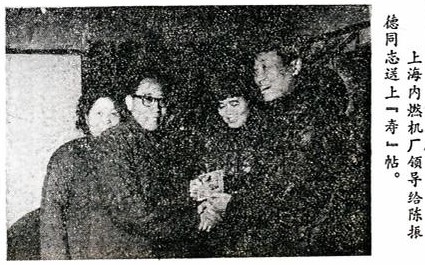 “啼啼”清脆的上海牌轿车的喇叭声从窗外传来,老陈刚走到房门口,就见厂党委书记张虎林和副厂长李伯顺同志兴高采烈地拎着喜庆蛋糕和捧着印有“寿”字的寿帖走上前来,连声地说:“陈师傅,恭喜,恭喜,祝您长寿。”陈师傅眼望着烫金的“寿”字,两眼湿润,情不自禁地流出眼泪来。在朦胧的泪雾中,“文革”初期一天的情景又浮在眼前:一群如狼似虎的造反队员闯进他的家门,全家上下狼狈不堪,一家老小垂泪一旁,敢怒不敢言……望着眼前张张笑脸,他激动地向同志们说:“厂里开着车子到我家来只有两次,上一次是“文化大革命”中到我家来抄家的,今天,厂领导却是到我家为我祝寿的。”