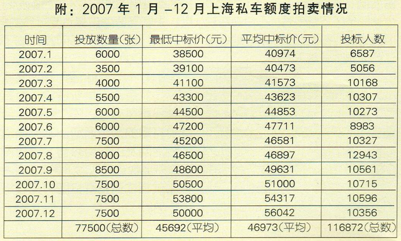 分析人士指出,去年上海市场的各车型上牌总体呈现小幅微涨态势,但结构性差异较为明显。其中进口小客车的增幅最大,同比增长达到43.34%,显示出上海车市对其仍有较大的需求量。而国产轿车中的微型车去年在市场的表现则较为低迷,1月-12月,微型车上牌总数为2358张,同比下降33.75%,全年呈现出连续负增长的态势。私车额度价格方面,全年平均价格维持高位,并持续走高,纪录不断被刷新。2007年的最后3个月,上海私车额度拍卖平均中标价均超过了5万元,分别达到5.1万元、5.4万元和5.6万元。