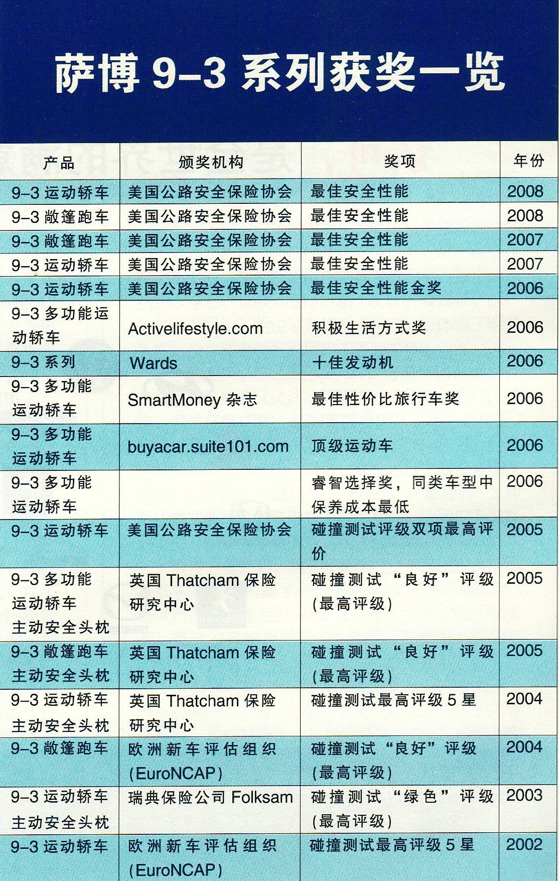 萨博9-3运动轿车、多功能运动轿车和敞篷跑车,荣获美国公路安全保险协会(I-IHS):2008年中型车类别最佳安全性能奖(Top Safety Pick Award)。