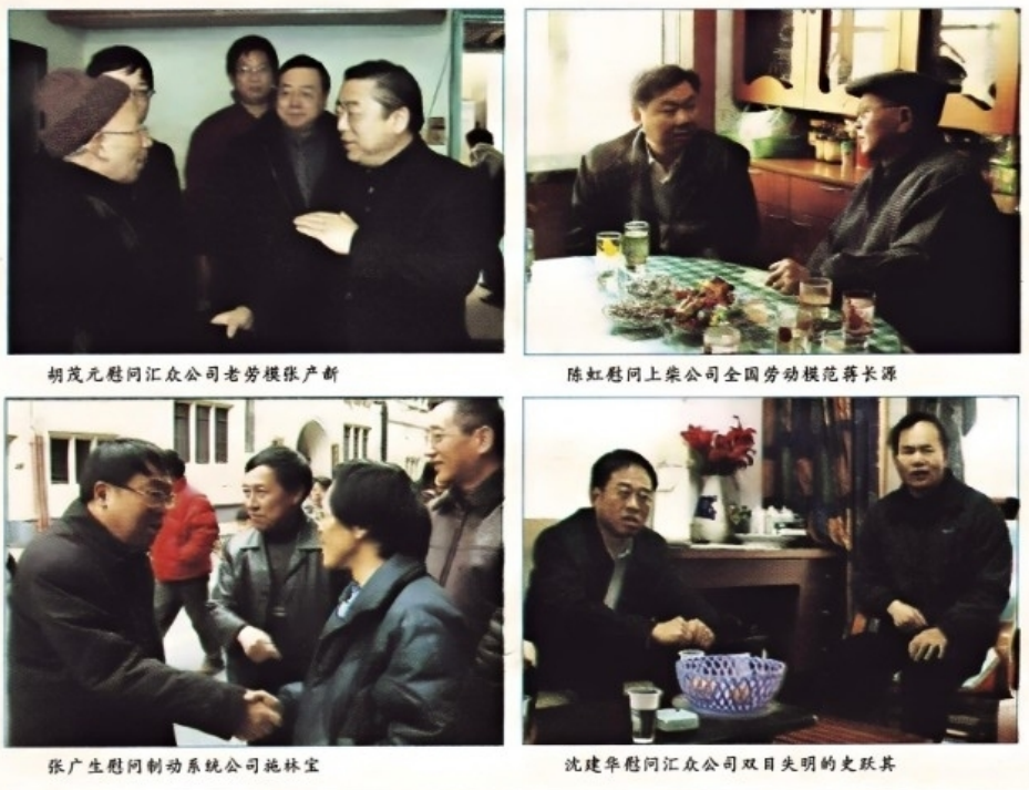 本报讯 严冬的凛冽寒风挡不住关爱员工的温情。春节前夕,上汽董事长、党委书记胡茂元,上汽集团副董事长、上海汽车总裁陈虹,上汽集团副董事长张广生,上汽集团总裁沈建华,以及蒋志伟、陈志鑫、李积荣、肖国普、周郎辉、丁磊、叶焱章、叶永明、俞建伟、朱根林和吴诗仲等领导兵分几路来到30余名老劳模和困难职工的家中,向他们送上新春的祝福和诚挚的慰问。