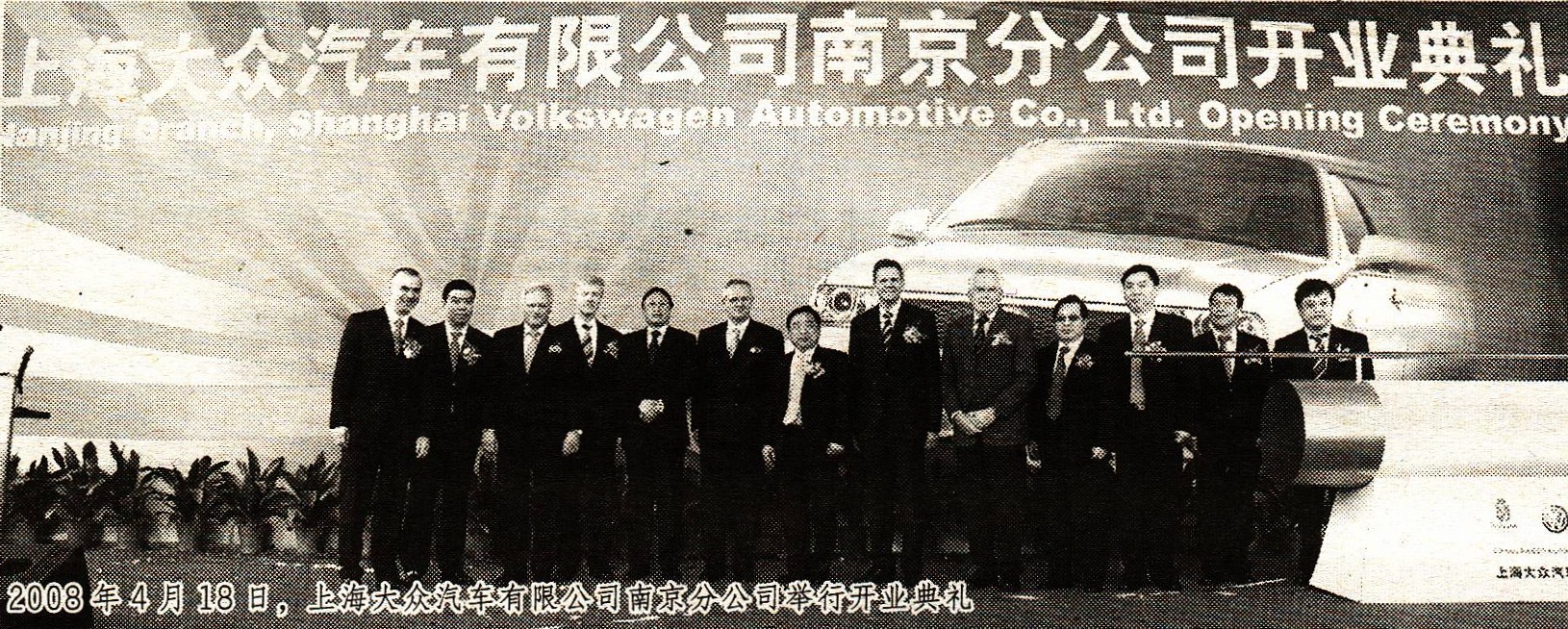 4月18日上午11时,在南京市江宁经济开发区,诞生了一个中国汽车发展史上难忘的时刻。两大世界汽车巨头在此聚首——全球第四大汽车生产商大众汽车集团董事会主席文德恩,世界500强、中国三大汽车集团之一上海汽车工业(集团)总公司董事长胡茂元,以及上海大众董事会全体成员,江苏省、南京市政府领导,各相关部门领导,全体出席上海大众汽车有限公司南京分公司开业典礼。
