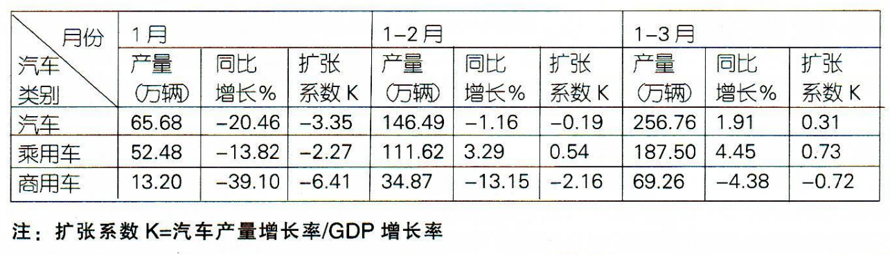 表中汽车整体市场扩张系数K值为0.31,乘用车市场扩张系数Kc为0.73,商用车市场扩张系数Ks为-0.72。3项扩张系数都很低,低于下限“1”。其中1项是负值,2项是小于1的正值。“车市波动分析法”规定:如果扩张系数是负值,或小于1的正值,那么汽车市场处于“收缩效应”范围内。因此可以判定:中国一季度汽车市场仍在“谷底”运行。此外,由于商用车扩张系数是负值,影响了汽车整体市场,使其K值处于偏低水平。
