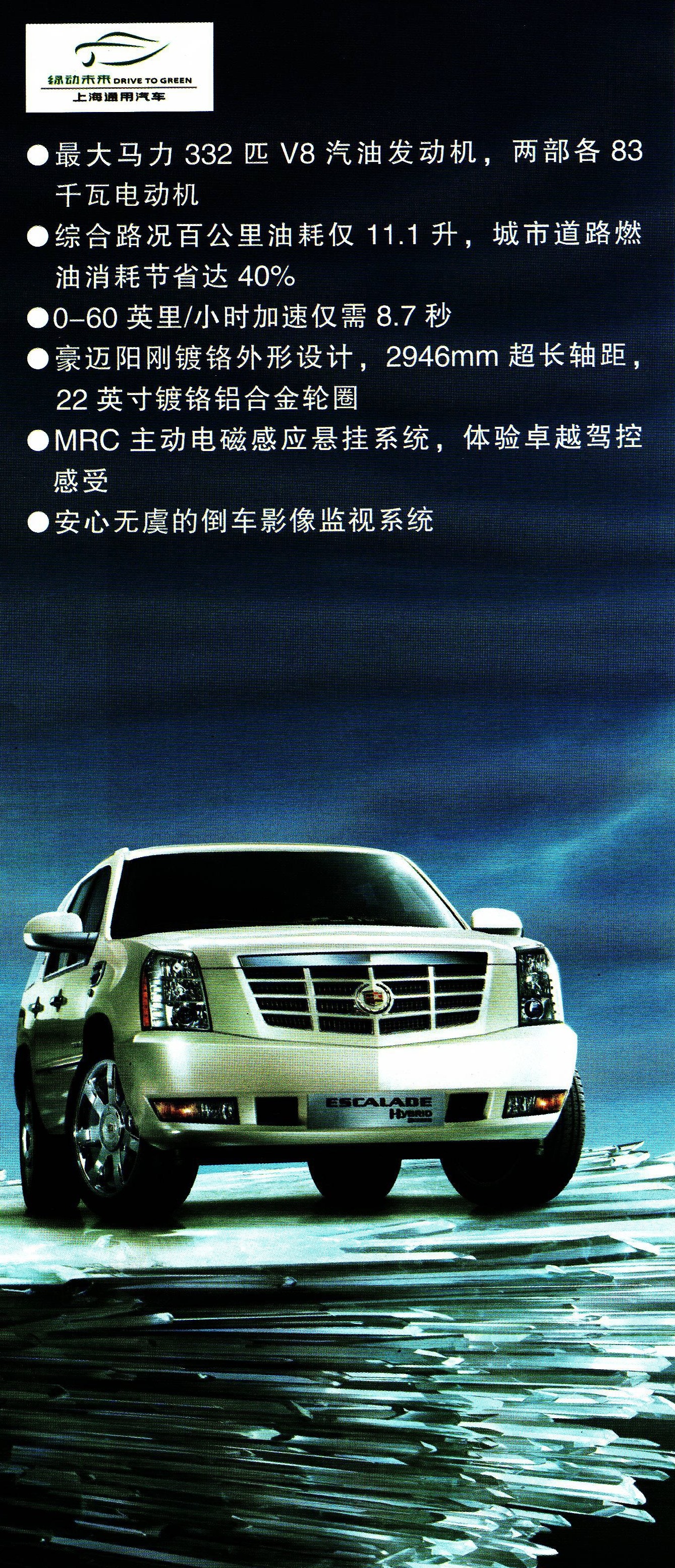 凯迪拉克凯雷德Hybrid搭载业界领先双模油电混合动力技术,是发展“更好性能、更低能耗、更少排放”绿色产品的又一实质性产品举措,彰显了上海通用汽车践行“绿动未来”的又一庄严承诺。
