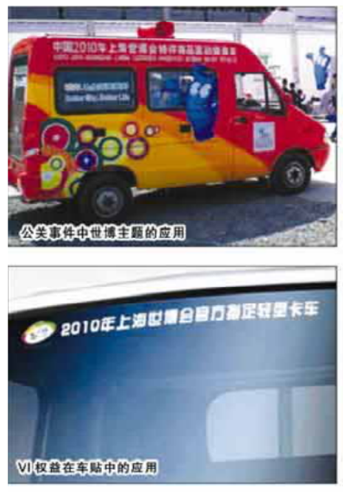 首先,利用车贴等形式,对上汽世博Ⅵ权益及指定称谓权益进行最大化运用。南京依维柯在产品包装上突出世博概念,以“世博官方指定用车”为包装,在车辆前窗及尾部醒目位置贴上由上汽世博2.0版本LOGO和指定称谓组成的车贴。通过这样的手法将南京依维柯与上汽品牌资产进行链接,在销售过程中突出上汽旗下产品概念,同时所植入的世博元素又赋予产品国际化、可靠的产品形象,与竞争对手形成区隔,最终达到产品销售和品牌提升的目标。