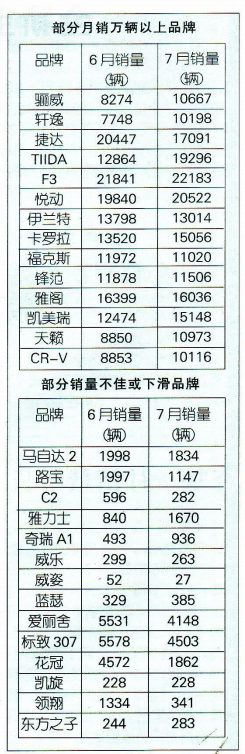 7月的乘用车市场以同比销量大涨近八成摘掉戴了几年的“淡季”帽子,几乎所有企业的主力车型在7月间全线旺销,有的品牌甚至销量环比接近翻番。当然,也并非所有品牌都赶上了这场车市盛宴,尤其是那些受惠于政策扶持的品牌,销量原地踏步甚至有倒退者也不在少数。