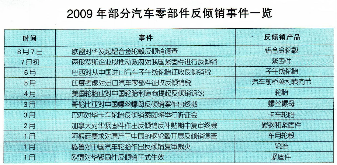 眼下闹得最沸沸扬扬的莫过于中国汽车零部件在海外遇阻,美国国际贸易委员会要求对从中国进口的轮胎征收惩罚性关税,欧盟宣布对中国出口的铝合金轮毂发起反倾销立案调查;而今年早些时候,澳大利亚、印度、巴西、阿根廷等国对我国出口的钢制轮毂、紧固件、刹车盘和转向节等进行了反倾销。一时间,在中国汽车对外贸易的上空,山雨欲来风满楼,中国汽车零部件出口正经受一场史无前例的严峻考验。