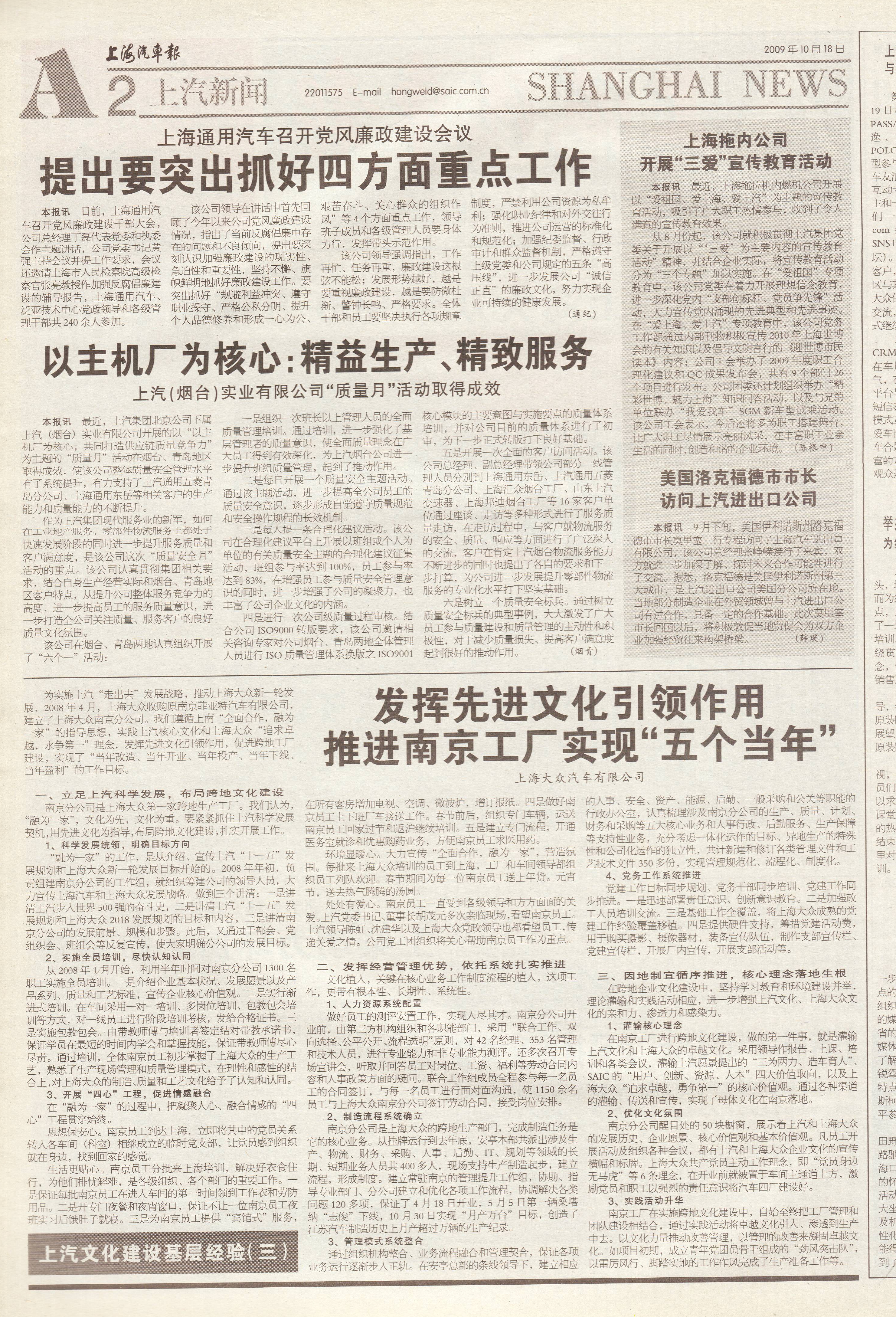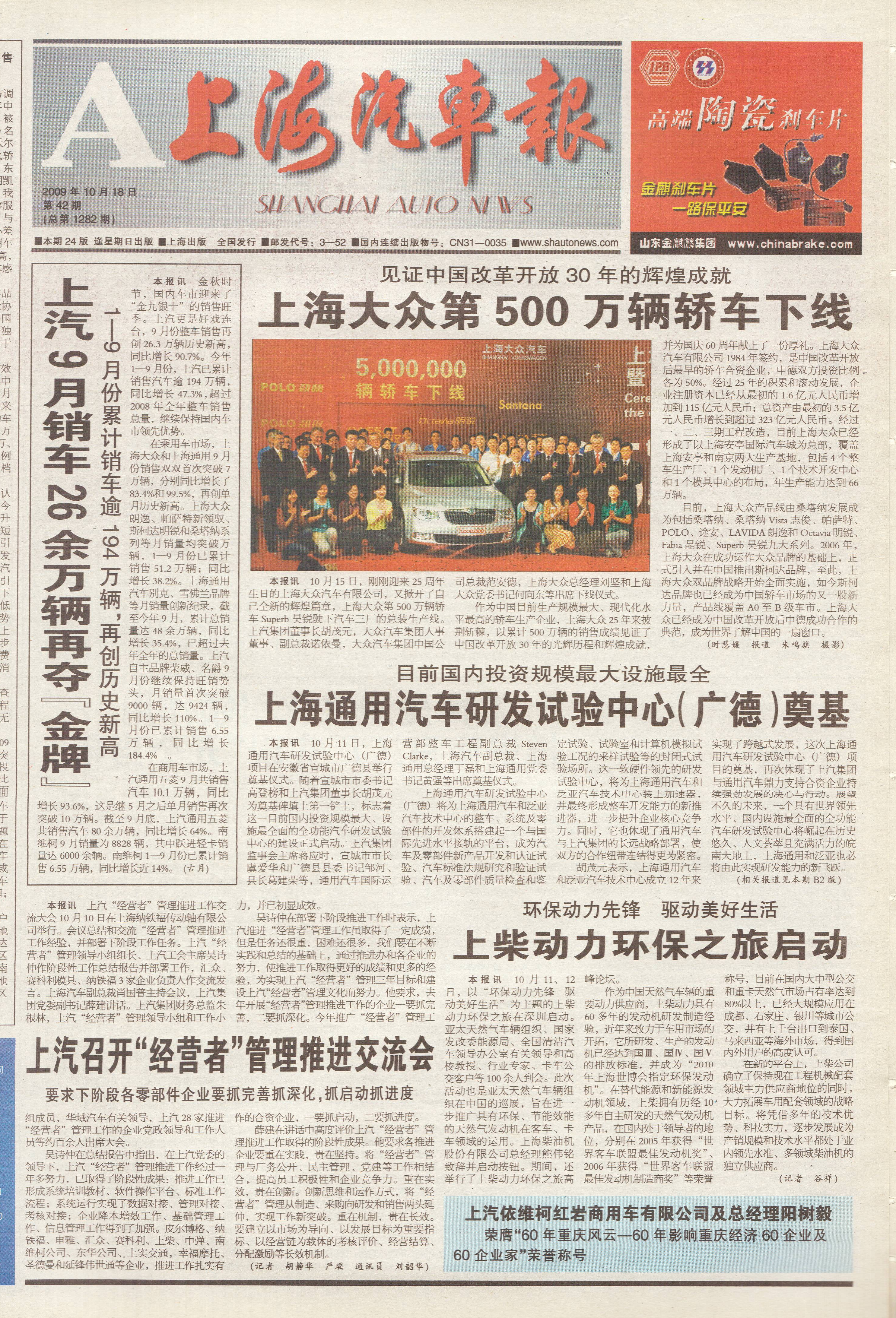 上海汽车报首页 上海大众第500万辆轿车下线 上汽9月销车26余万辆再夺“金牌” 上海通用汽车研发试验中心(广德)奠基 上汽召开“经营者”管理推进交流会 上柴动力环保之旅启动