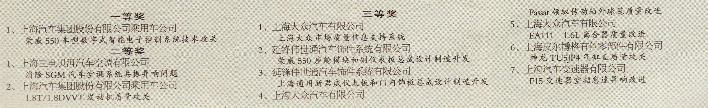 2009年“上海市重点产品质量振兴攻关成果奖”上汽获奖项目
