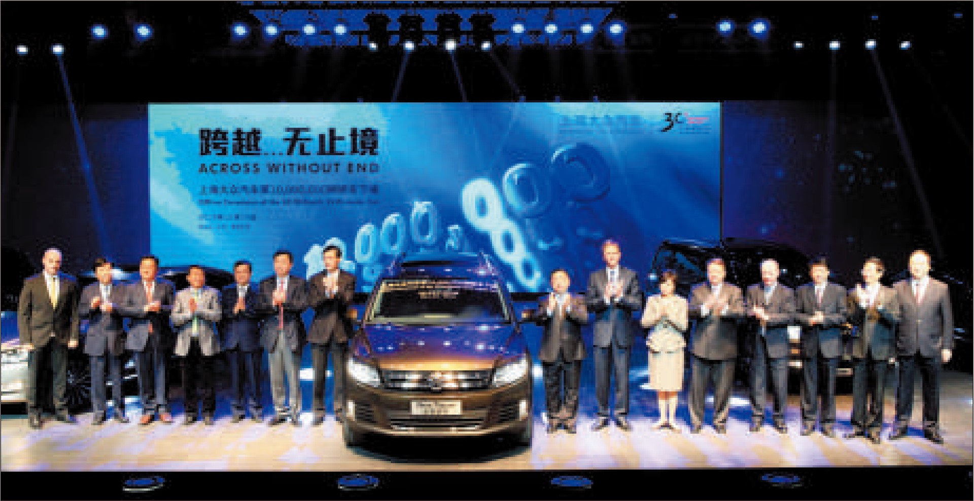 本报讯 11月15日,在安亭上海大众总部,随着一辆峻岭棕色全新途观的闪亮登场,上海大众汽车有限公司迎来了第1000万辆轿车的下线,从而成为国内第一家产量突破1000万辆的轿车生产企业,再度创下国内乘用车行业新纪录。同时,上海大众正式揭示以“与卓越同行”为主题的企业30周年标识,拉开了迎接上海大众30周年的序幕。上汽集团董事长胡茂元、上汽集团总裁陈虹,嘉定区委书记马春雷、嘉定区副区长孙伟,大众汽车集团(中国)总裁兼首席执行官海兹曼出席下线仪式,上海大众总经理张海亮主持。