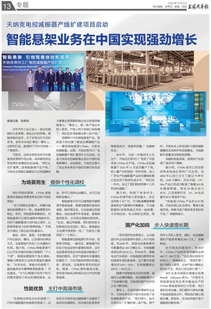 事实上,在诸多国际零部件企业中,天纳克率先在中国市场实现了电控减振器国产化。“我们预计,如今在常州工厂扩建的第二条产线,将于明年8月投入使用。届时,电控减振器的产能将再增加200万支。”吴啸林说。