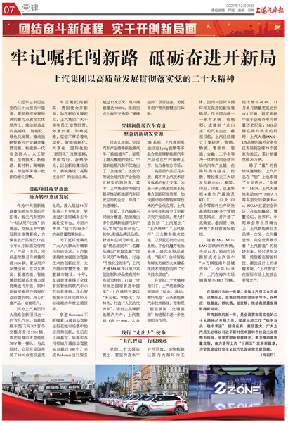 即将到来的新一年,是全面贯彻落实党的二十大精神的开局之年,实现经济工作“稳字当头、稳中求进”,使命在肩、责任重大。广大上汽员工必将以习近平新时代中国特色社会主义思想为指导,全面贯彻新发展理念,着力推动高质量发展,奋力谱写上汽“十四五”发展新篇章,为全面建设社会主义现代化国家做出新贡献。(尚启轩)