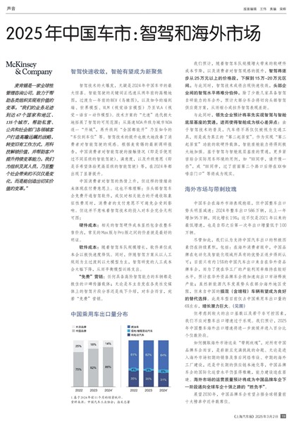 智驾技术的大爆发,无疑是2024年中国车市的最大惊喜。智能驾驶的关键词正迅速从两年前的高精地图,过渡为一年前的BEV(鸟瞰图),以及如今的端到端、世界模型、VLM(视觉语言模型)乃至VLA(视觉-语言-动作模型)。技术方案的“光速”迭代极大地拓展了智驾的可用范围:从高速NOA升级为城市NOA逐一“开城”,再升级到“全国都能开”乃至如今的“车位到车位”等。智驾技术的提升也极大地改善了消费者对智能驾驶的观感。根据麦肯锡的最新调研报告,中国消费者对智能驾驶的接触情况(即是否使用过不同层级的智能驾驶)、满意度,以及升级意愿(即是否希望体验更高层级的智能驾驶)等,在2024年都出现了显著提升。