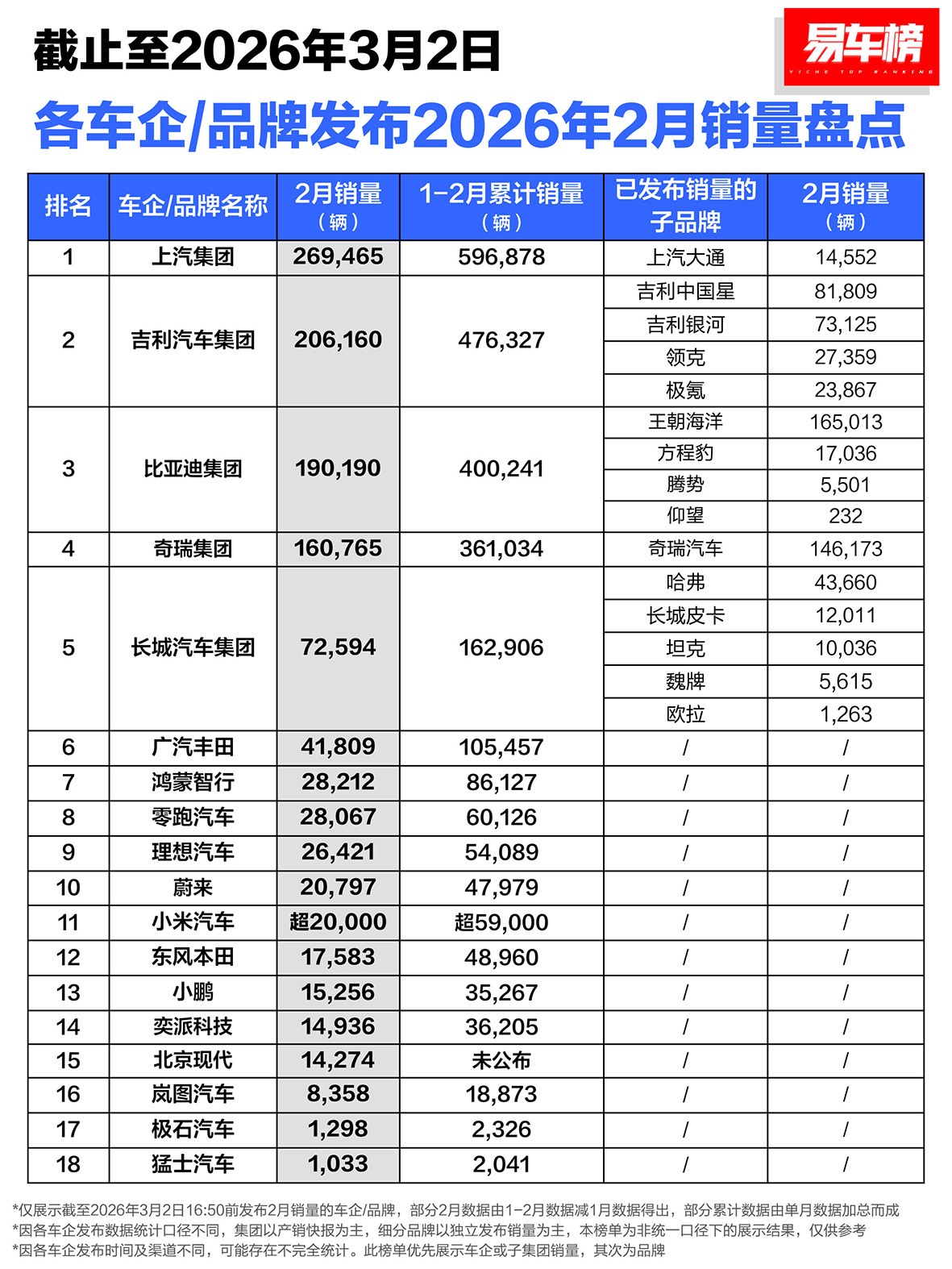 从年初的整体走势来看,上汽与吉利表现出了较强的经营韧性。2月份,上汽集团以26.9万辆销量大幅领跑,蝉联行业冠军,1—2月累计销量达59.7万辆,同比增长6.8%;吉利则在2月份交出了20.6万辆销量、同比增长1%的成绩单。